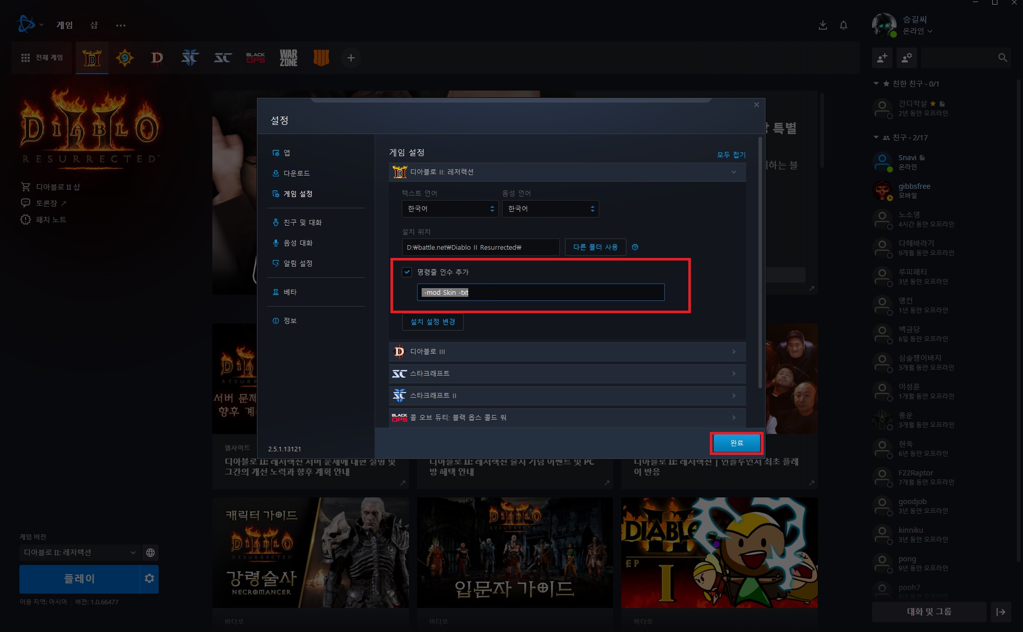 3. 디아블로2 레저렉션 옵션에서 명령줄 함수 추가를 체크하고, -mod Skin -txt 를입력후 완료.
