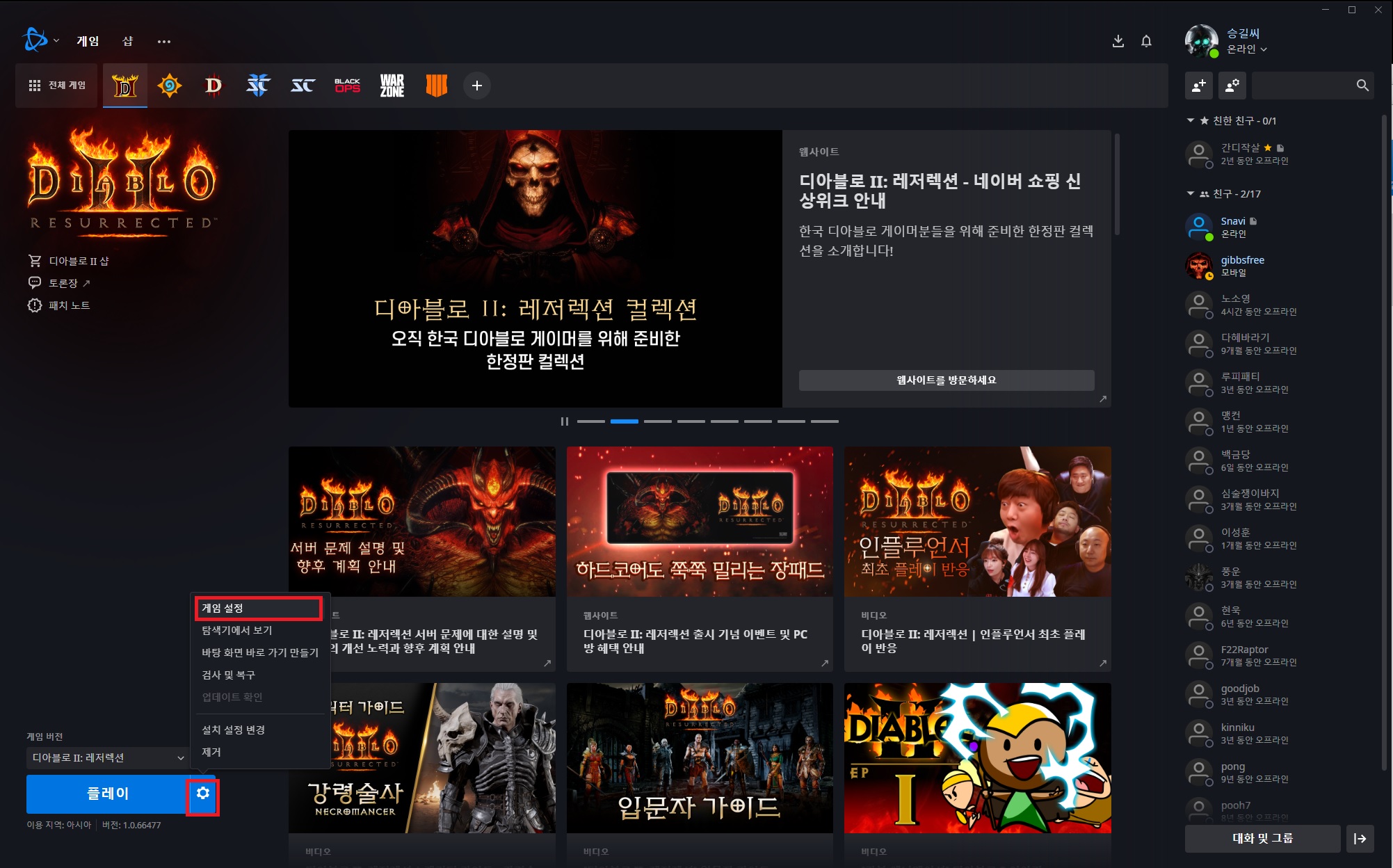 2. 배틀넷 클라이언트에서 플레이옆 톱니바퀴를 눌러 게임설정을 클릭.